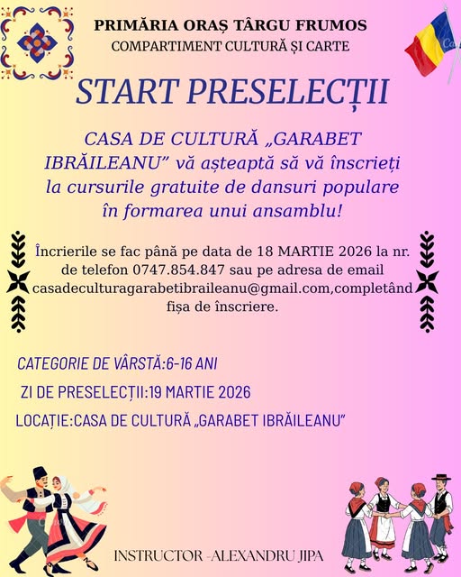 Copiii și adolescenții cu vârste între 6 și 16 ani sunt invitați să se înscrie la cursurile gratuite de dansuri populare organizate la Casa de Cultură „Garabet Ibrăileanu” din Târgu Frumos, în vederea formării unui nou ansamblu.