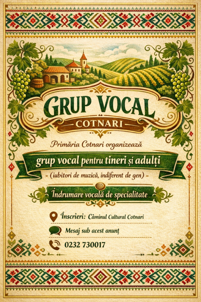 Primăria comunei Cotnari a lansat un proiect cultural prin care înființează un grup vocal destinat tinerilor și adulților interesați de muzică. Membrii grupului vor avea oportunitatea de a se pregăti vocal și de a participa la evenimente culturale și artistice în comunitate.