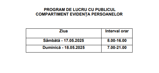 Serviciul Public Local Comunitar de Evidență a Persoanelor Pașcani anunță că, în scopul asigurării desfășurării în condiții optime a procesului electoral pentru alegerea Președintelui României din data de 18 mai 2025, va avea un program de lucru special cu publicul, după cum urmează:
