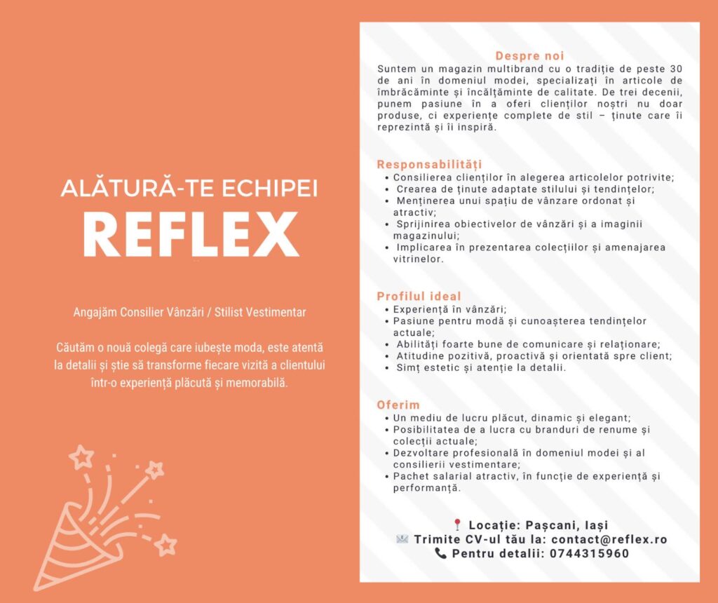 Anunțuri publicitareReflex Pașcani angajează consilier vânzări/stilist vestimentar de RedacțiaOctober 28, 2025October 28, 2025049 Share0