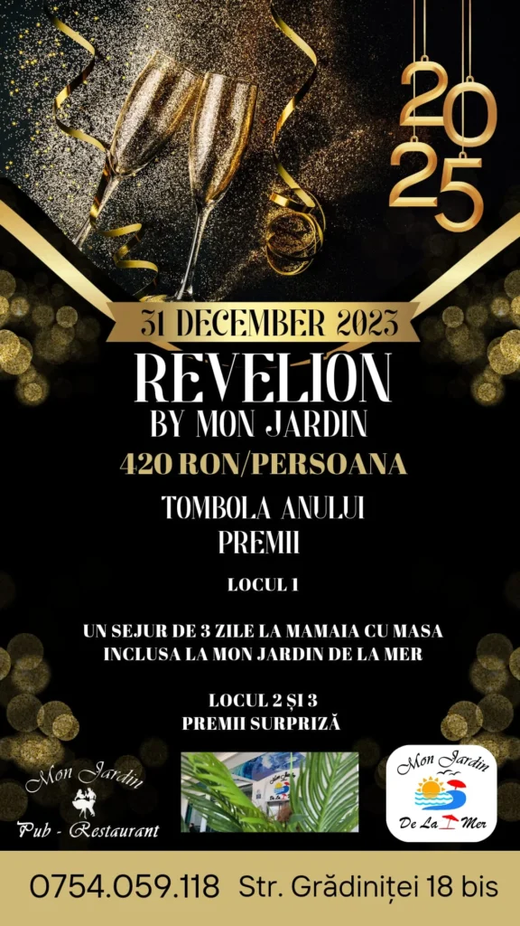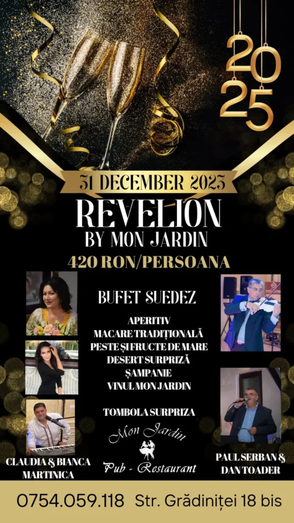 Mon Jardin organizează o petrecere de Revelion cu un meniu rafinat și divertisment variat. Oferta culinară include un bufet suedez fără limite, cu aperitive, platouri tradiționale, preparate din pește și fructe de mare, iar la final, un desert surpriză. Preparatele vor fi disponibile pe fiecare etaj, iar băuturile vor fi servite la discreție.