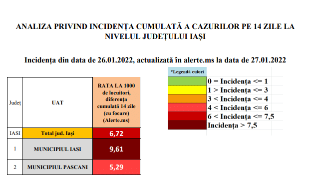 Conform datelor existente la nivelul CNCCI la data de 27 ianuarie 2022, ora 10.00, în intervalul de 24 de ore, au fost înregistrate 31.683 de cazuri de persoane pozitive cu SARS-COV-2. De asemenea, au fost raportate 71 de decese, dintre care 2 decese anterioare.