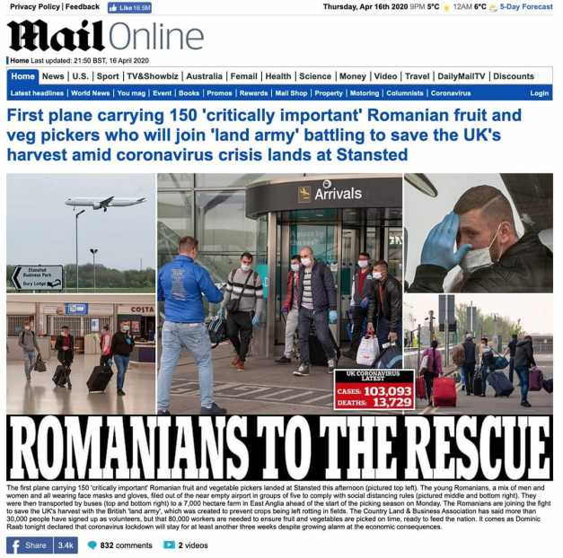 Presa şi autorităţile britanice i-au întâmpinat pe culegătorii români ca pe nişte eroi, cu exprimări elogioase – „sunt gata să ne salveze agricultura şi să hrănească naţiunea“. La apelul oficial de ajutorare al fermierilor, în lipsa est-europenilor care vin în fiecare sezon la muncă, britanicii s-au înscris în număr de 30.000 ca voluntari la cules de fructe şi legume – dar până la numărul necesar de 80.000 mai e cale lungă. „Românii ne vor da răgazul necesar să-i instruim şi pe voluntari ce au de făcut“, au declarat englezii.