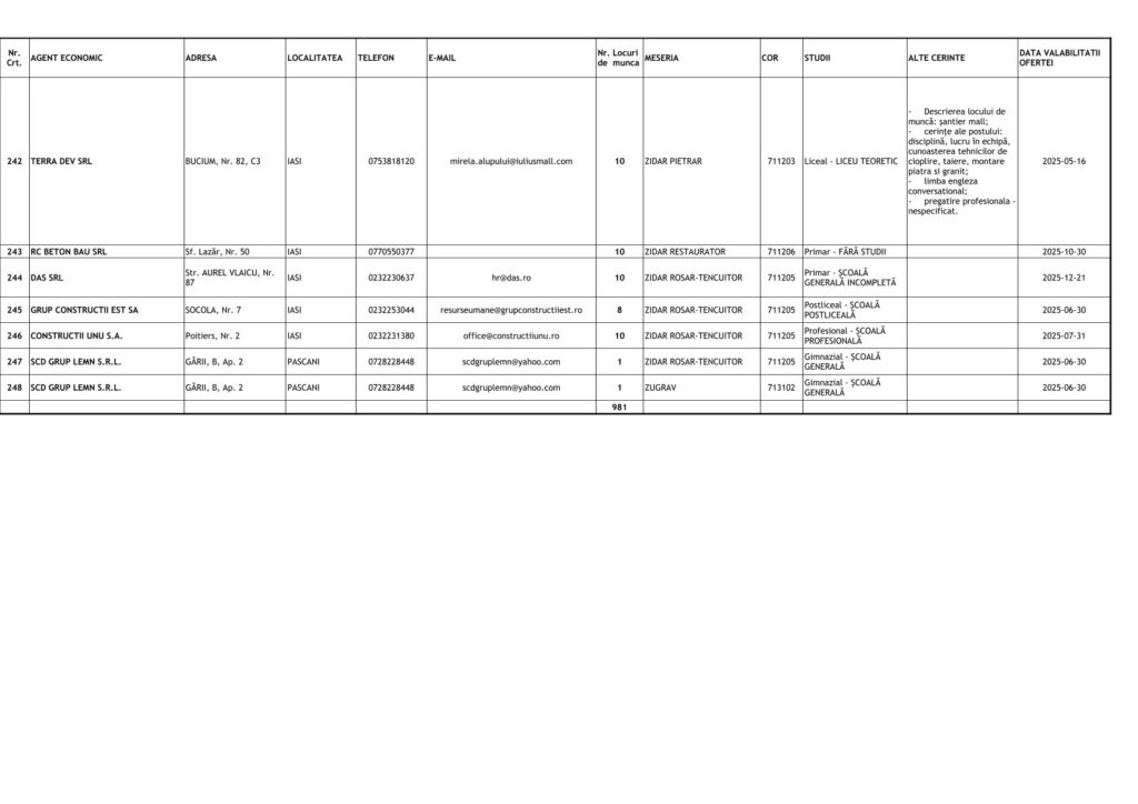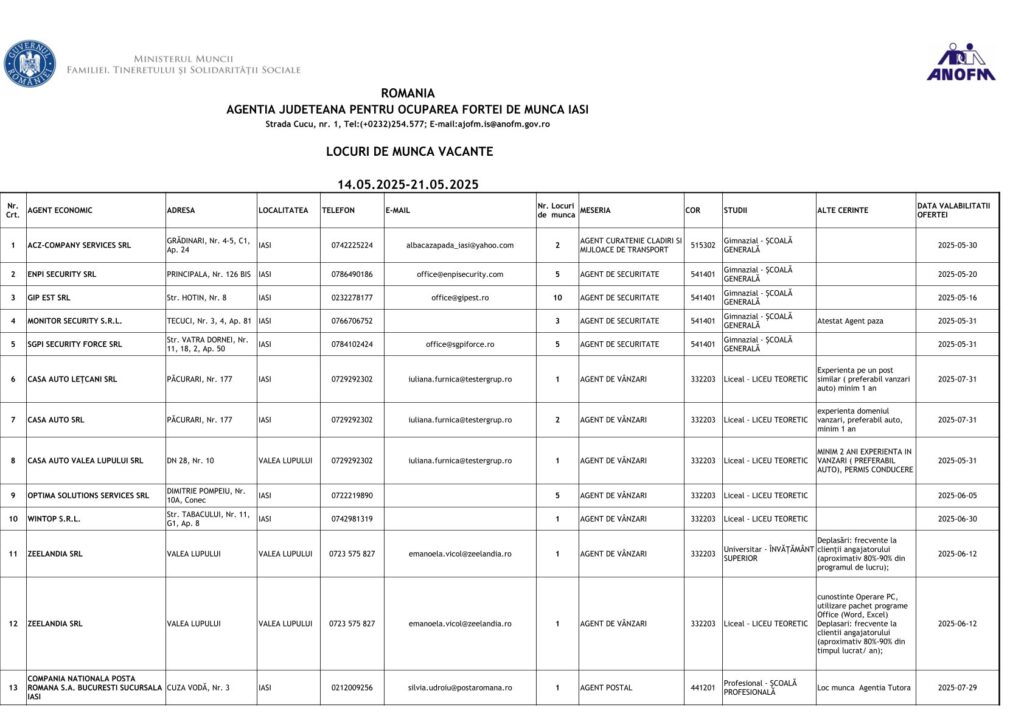Agenția Judeațeană pentru Ocuparea Forței de Muncă Iași (AJOFM) a publicat oferta de locuri de muncă disponibile pentru perioada 14 -21 mai 2025, care include un total de 981 de posturi vacante în diverse domenii.