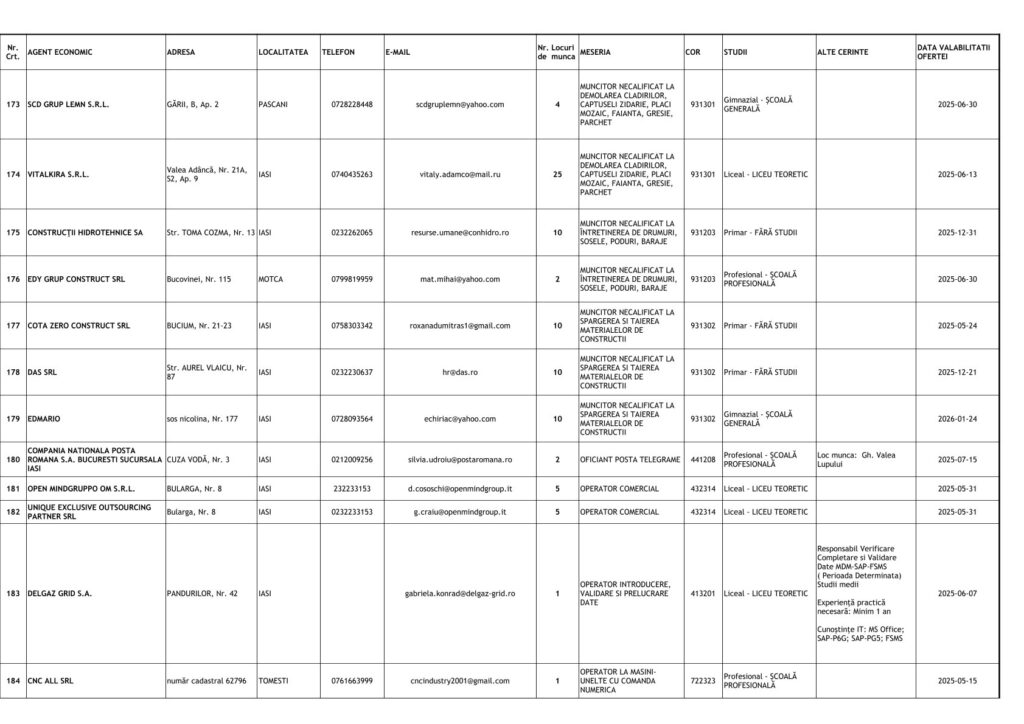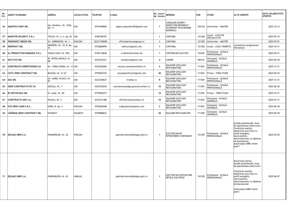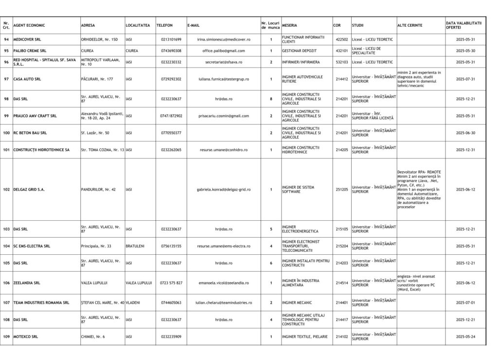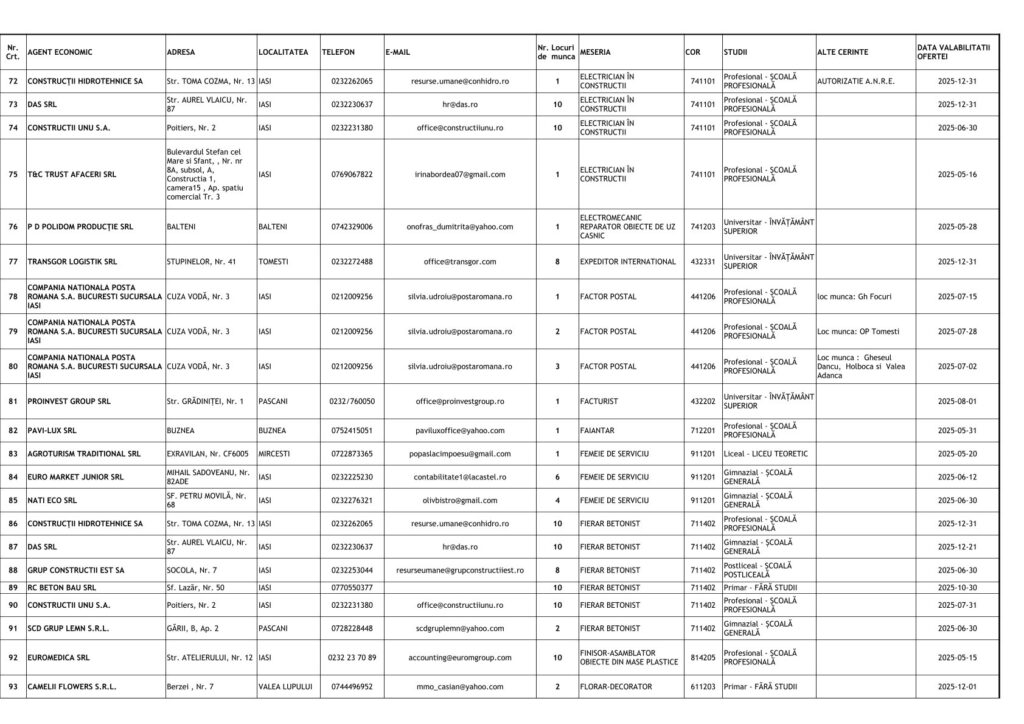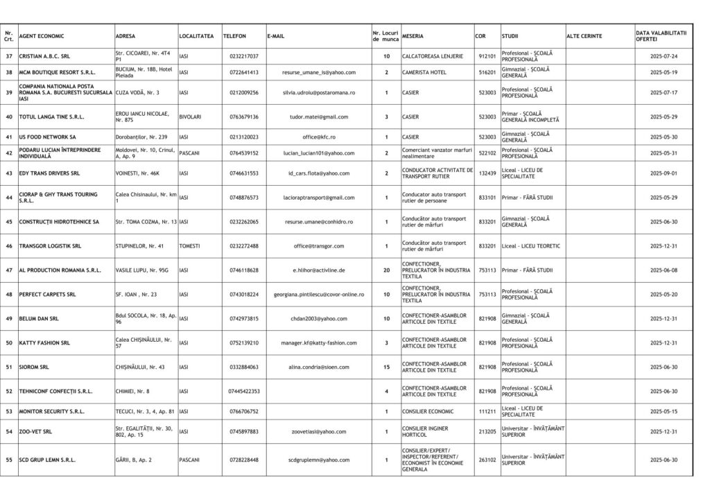 Printre cele mai căutate locuri de muncă se numără posturi pentru muncitori necalificați, dar și pentru specialiști în domenii tehnice și administrative. Detalii despre joburile disponibile și condițiile de angajare pot fi obținute direct de la AJOFM Iași sau prin intermediul site-ului agenției.