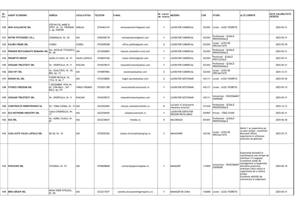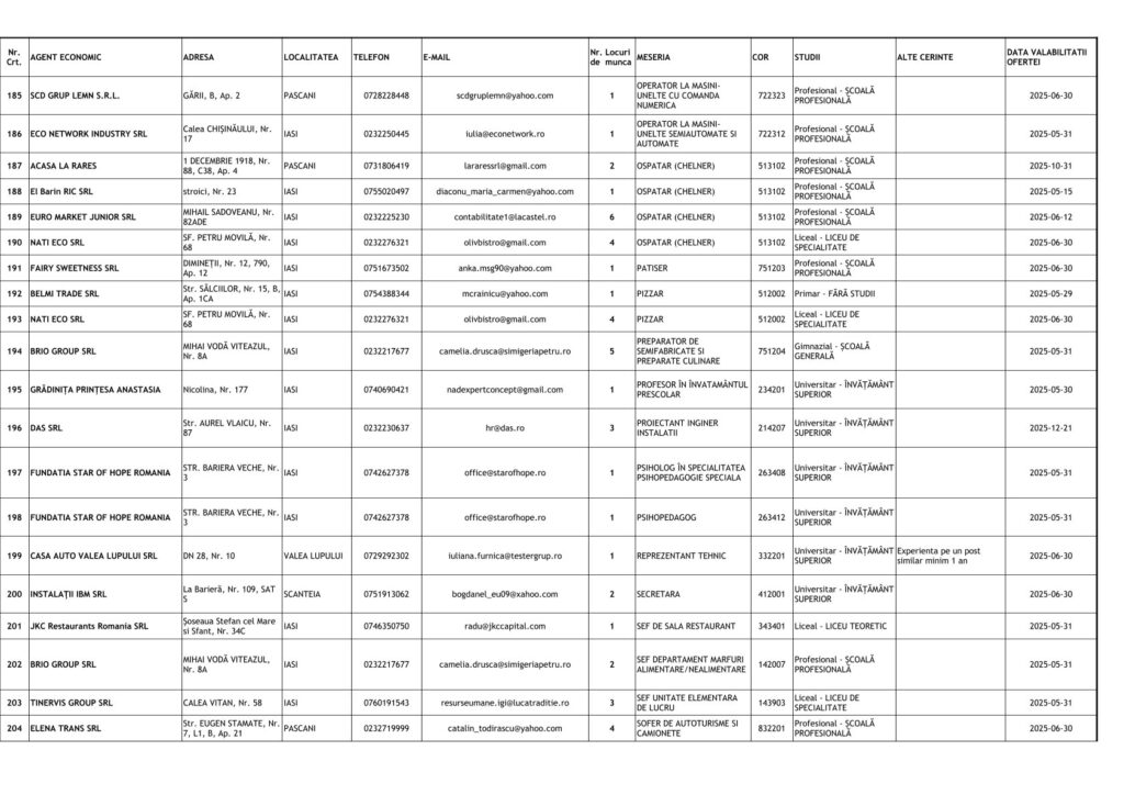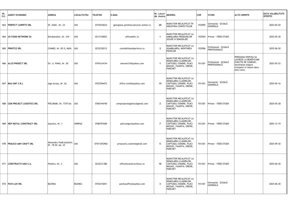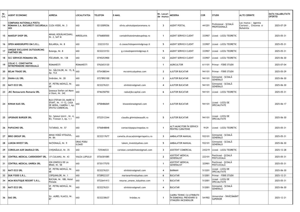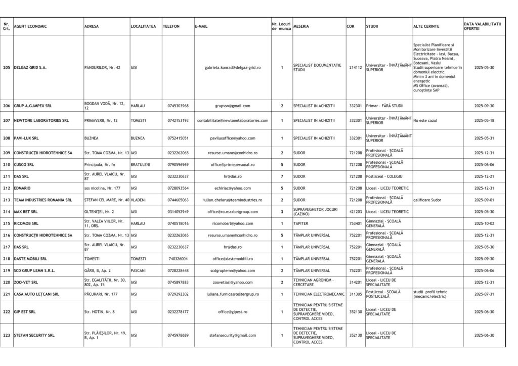 Printre cele mai căutate locuri de muncă se numără posturi pentru muncitori necalificați, dar și pentru specialiști în domenii tehnice și administrative. Detalii despre joburile disponibile și condițiile de angajare pot fi obținute direct de la AJOFM Iași sau prin intermediul site-ului agenției.