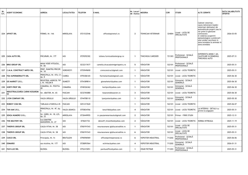 Persoanele interesate sunt încurajate să aplice pentru locurile de muncă vacante și să se prezinte la sediul AJOFM sau online, pentru a beneficia de asistență în procesul de recrutare și ocupare a posturilor. Aceste oportunități de angajare sunt un pas important pentru reducerea șomajului și integrarea rapidă pe piața muncii din județul Iași.