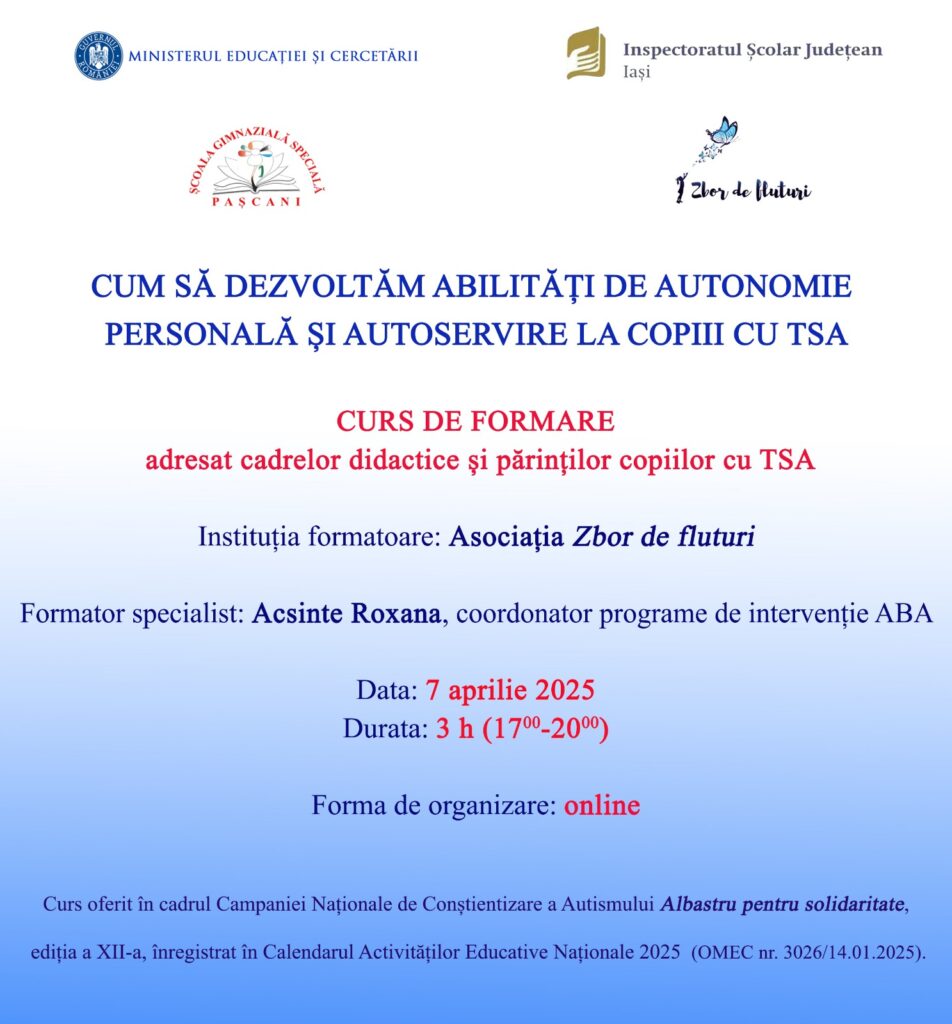 În cadrul Campaniei Naționale de Conștientizare a Autismului „Albastru pentru Solidaritate” – ediția a XII-a, Școala Specială Pașcani, în parteneriat cu Asociația Zbor de Fluturi, organizează un curs online esențial pentru dezvoltarea abilităților de autonomie personală și autoservire la copiii cu tulburări din spectrul autist (TSA).