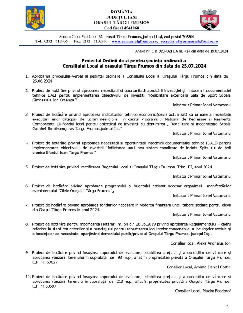 Legislativul local din Târgu Frumos se va întruni în ședina ordinară aferentă acestei luni, pe 25 iulie, în Sala Mare de ședințe din incinta Primăriei orașului Târgu Frumos. Spre aprobare vor fi supuse 10 proiecte aflate pe ordinea de zi.