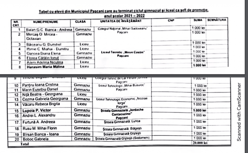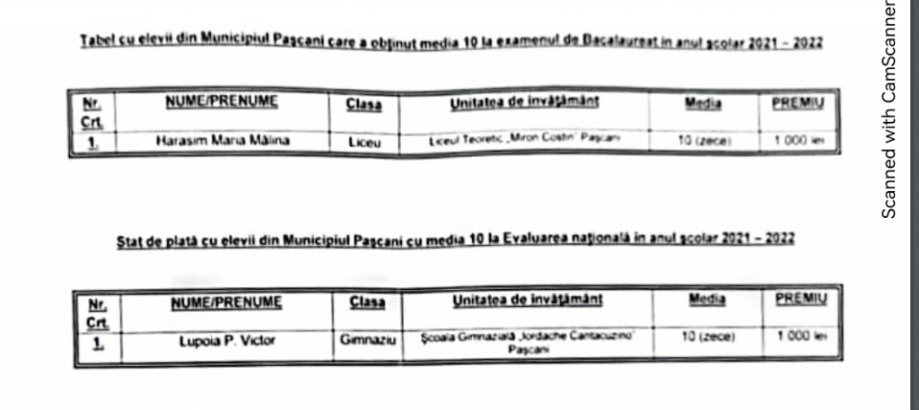 Astăzi, la Primăria Pașcani a fost răsplătită performanța elevilor de la școlile și liceele din municipiu. 20 șefi de promoție, de la unitățile de învățământ din municipiu și suburbii, alături de absolvenții care au obținut media 10 la Bacalaureat și Evaluarea Națională, au fost premiați de autoritățile locale cu câte 1000 de lei fiecare, flori și o diplomă. De asemenea, reprezentanții unităților de învățământ au primit câte o diploma de excelență și flori.