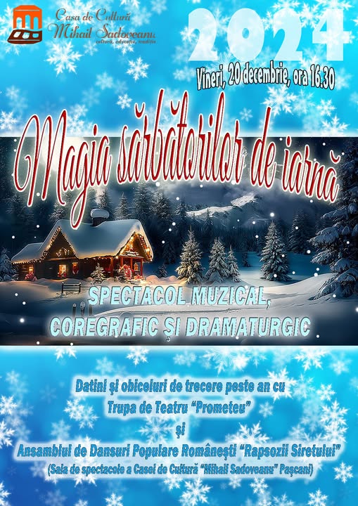 Bucuria sărbătorilor de iarnă va fi adusă pe scena Casei Municipale de Cultură din Pașcani de către membrii trupei de teatru Prometeu și Ansamblului de dansuri populare românești ”Rapsozii Siretului” ai Casei Municipale de Cultură din Pașcani. Spectacolul va avea loc vineri, 20 decembrie începând cu ora 16.30.
