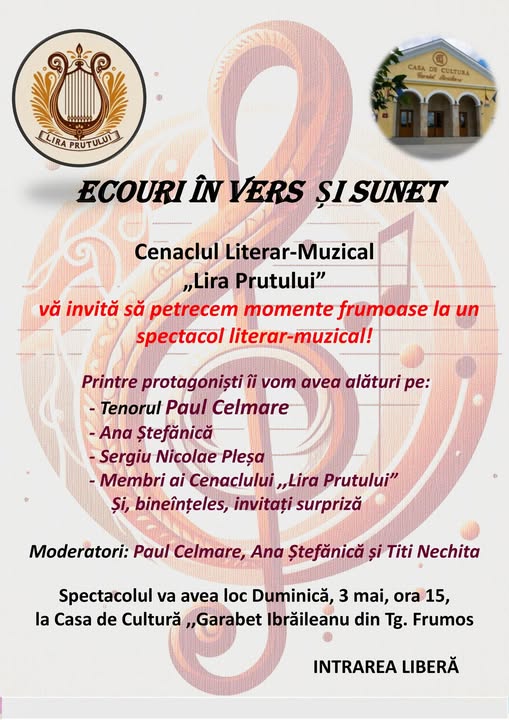 Cenaclul Literar-Muzical „Lira Prutului” invită locuitorii din Târgu Frumos la un eveniment cultural deosebit, intitulat „Ecouri în vers și sunet”. Spectacolul va avea loc duminică, pe data de 3 mai, începând cu ora 15:00, la Casa de Cultură „Garabet Ibrăileanu”.