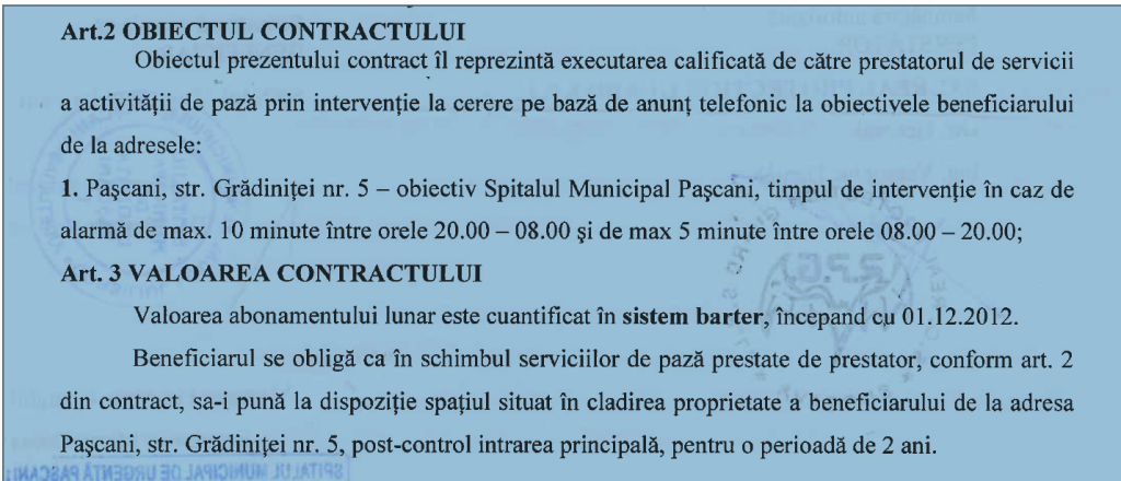 Pornind de la aceste discuții am solicitat conducerii Spitalului Municipal de Urgență, printr-o cerere de informații publice, să ne prezinte care sunt relațiile de colaborare cu firma de pază ce poate fi văzută frecvent la intrarea principală a unității medicale. Din răspunsul transmis am aflat că Spitalul Municipal de Urgență Pașcani are contract cu o firmă specializată de pază și protecție, încă din anul 2012. Vorbim de un contract de colaborare încheiat cu firma de pază RPG Protection Guard SRL. În acest contract este stipulat:”Obiectivul contractului îl reprezintă executarea calificată de către prestatorul de servicii a activității de pază prin intervenție la cerere, pe bază de anunț telefonic la obiectivele beneficiarului de la adresele: Pașcani, strada Grădiniței nr.5 – obiectiv Spitalul Municipal de Urgență Pașcani, timpul de intervenție în caz de alarmă de maxim 10 minute între orele 20.00 – 08.00 și de maxim 5 minute între orele 08.00 – 20.00. Valoarea abonamentului lunar este cuantificat în sistem barter, începând cu data de 01.12.2012. Beneficiarul serviciului se obligă ca în schimbul serviciilor de pază prestate, să-i pună la dispoziție spațiul situat în clădirea proprietate a beneficiarului de la adresă, strada Grădiniței, nr.5, post -control intrarea principală, pentru o perioadă de 2 ani de zile”, se specifică în contract.