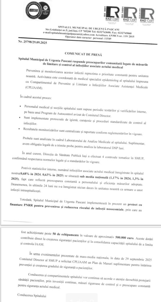 După tragediile care au îngrijorat opinia publică și au readus în discuție problema infecțiilor nosocomiale, Spitalul Municipal de Urgență Pașcani transmite că face din prevenirea și controlul acestor infecții o prioritate zilnică. În ultimii doi ani nu s-a înregistrat niciun un deces cauzat de infecțiile intaspitalicești.