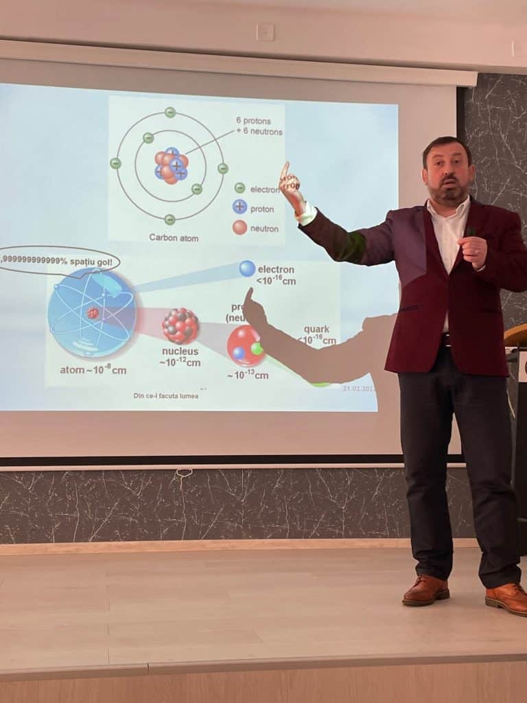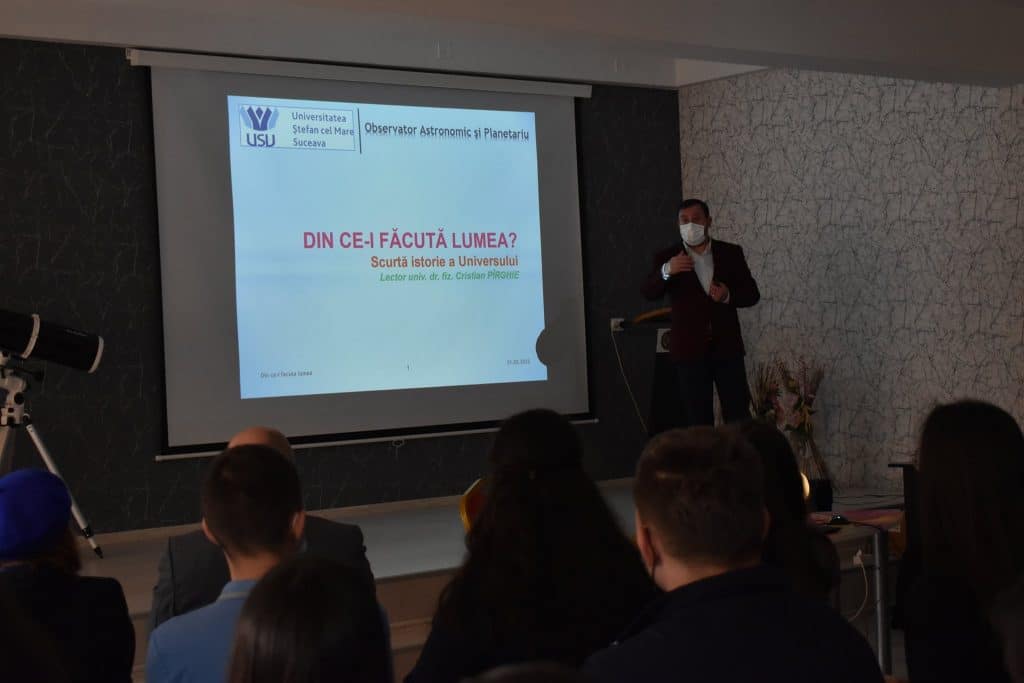 Domnul Cristian Pîrghie este totodată cercetător în cadrul colaborării LHCb-CERN, iar subiectul ilustrat de domnia sa a fost formarea universului și a lumii, punând accent pe utilitatea invențiilor actuale care ajută la examinarea necunoscutului din Univers.