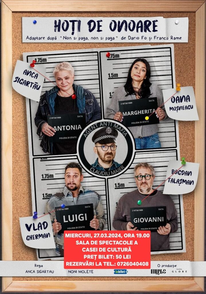 Așadar, și în acest an, sunteți invitați miercuri, 27 martie, începând cu ora 19.00 la supercomedia HOȚI DE ONOARE jucată de Anca Sigartău, Oana Moșneagu, Claudiu Maier, Bogdan Talașman și Vlad Gherman, în regia Ancăi Sigartău.