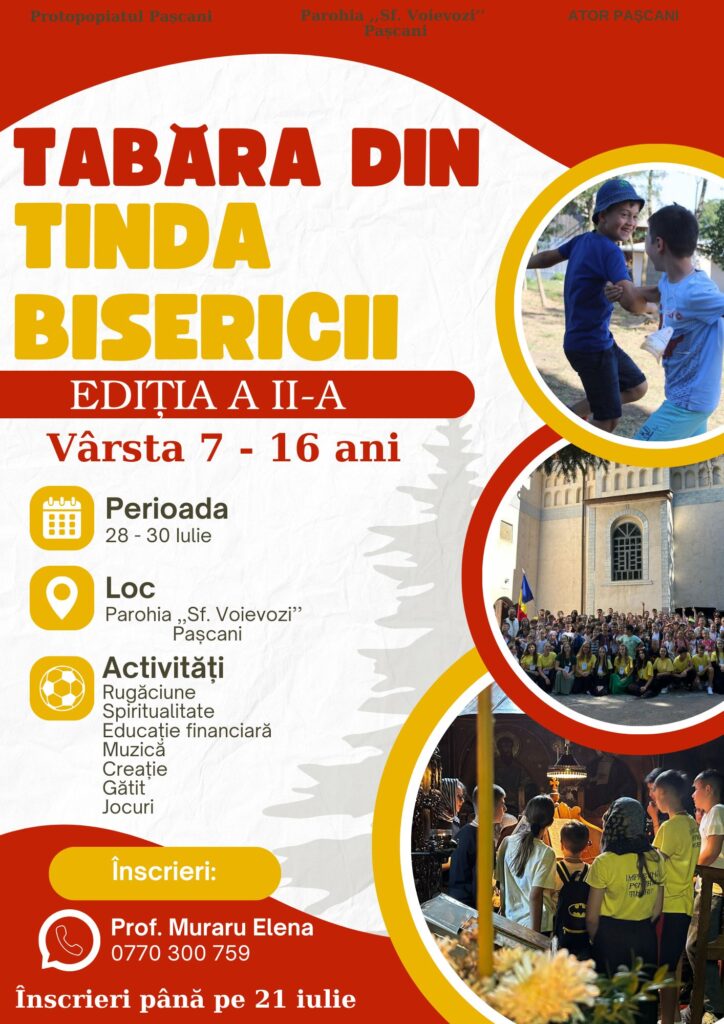 Parohia ”Sfinții Voievozi” organizează în perioada 28-30 iulie a doua ediție a Taberei din tinda Bisericii. Sunt așteptați sa se înscrie copiii cu vârsta între 7 și 16 ani.