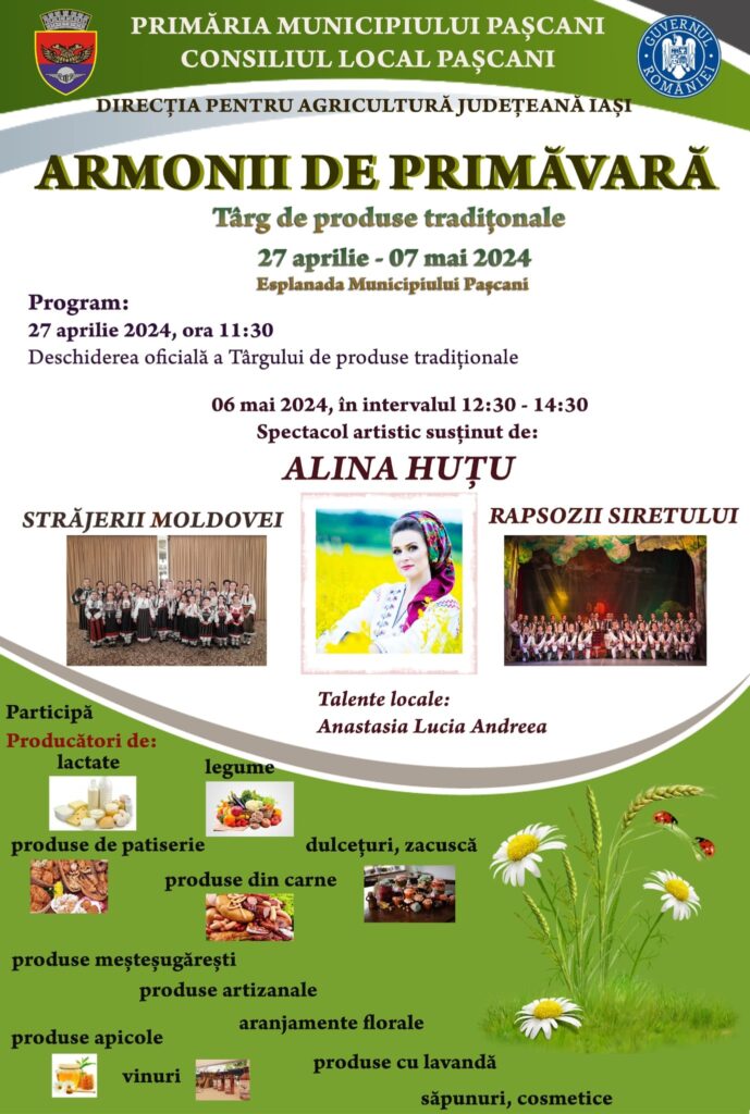 O nouă ediție a târgului de primăvară organizat la Pașcani ! Deschiderea oficială a evenimentul va avea loc pe esplanada din zona vale a municipiului. ”Armonii de primăvară” 2024 va reuni comercianți și producători agricoli din Pașcani, zonele învecinate, care vor avea marfă pe alese, brânzeturi, produse din carne, cozonac, prăjituri, produse apicole, legume, dulcețuri, zacuscă,produse de patiserie, săpunuri, cosmetice.