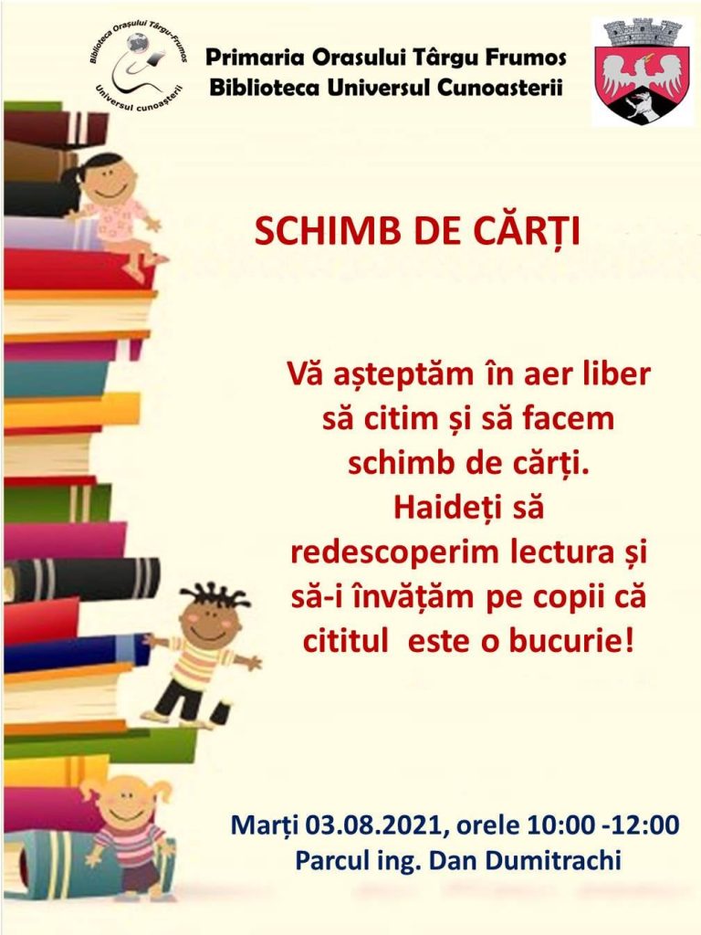 Biblioteca „Universul Cunoașterii”, împreună cu Primăria Orașului Târgu Frumos, organizează un eveniment în aer liber, intilulat „Schimb de cărți”, care se va desfășura marți, 3 august, între orele 10.00 – 12.00, în Parcul Ing. Dan Dumitrachi, din Târgu Frumos.