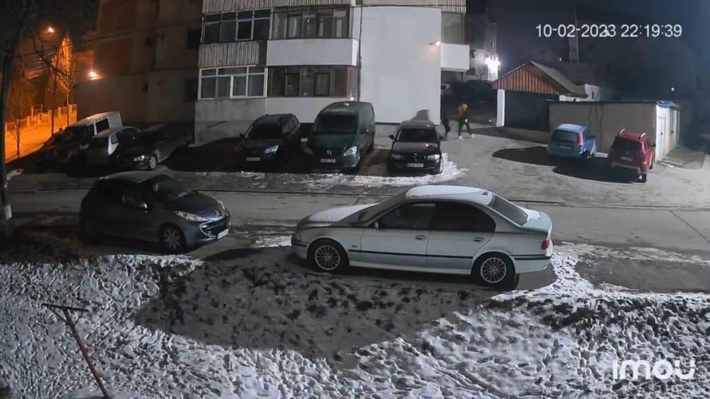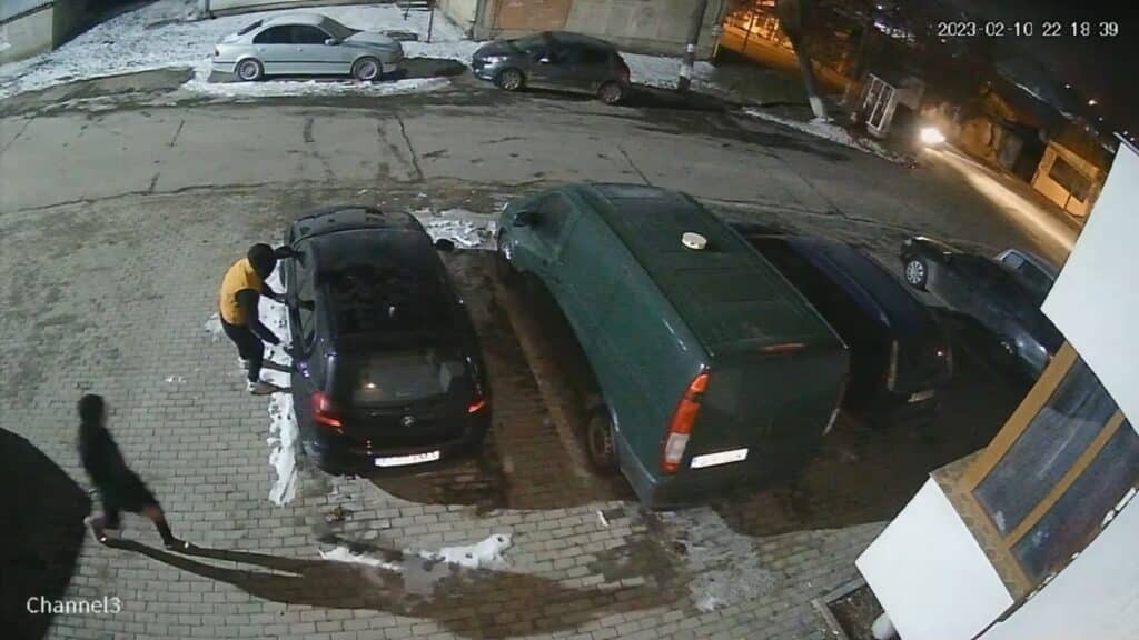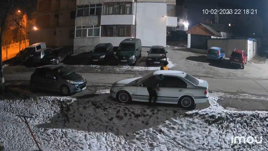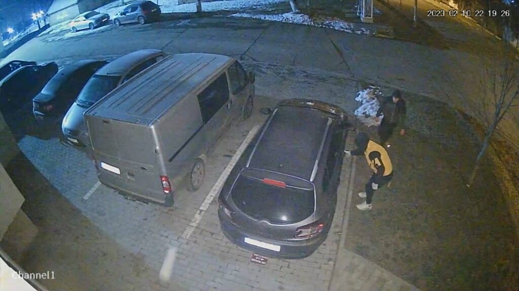 Chiar dacă era ora 22:15 când au fost surprinși de camerele de supraveghere de pe un imobil, autorii nu par a ține cont că se expun. Ei forțează portierele mai multor mașini, după care se fac nevăzuți.
