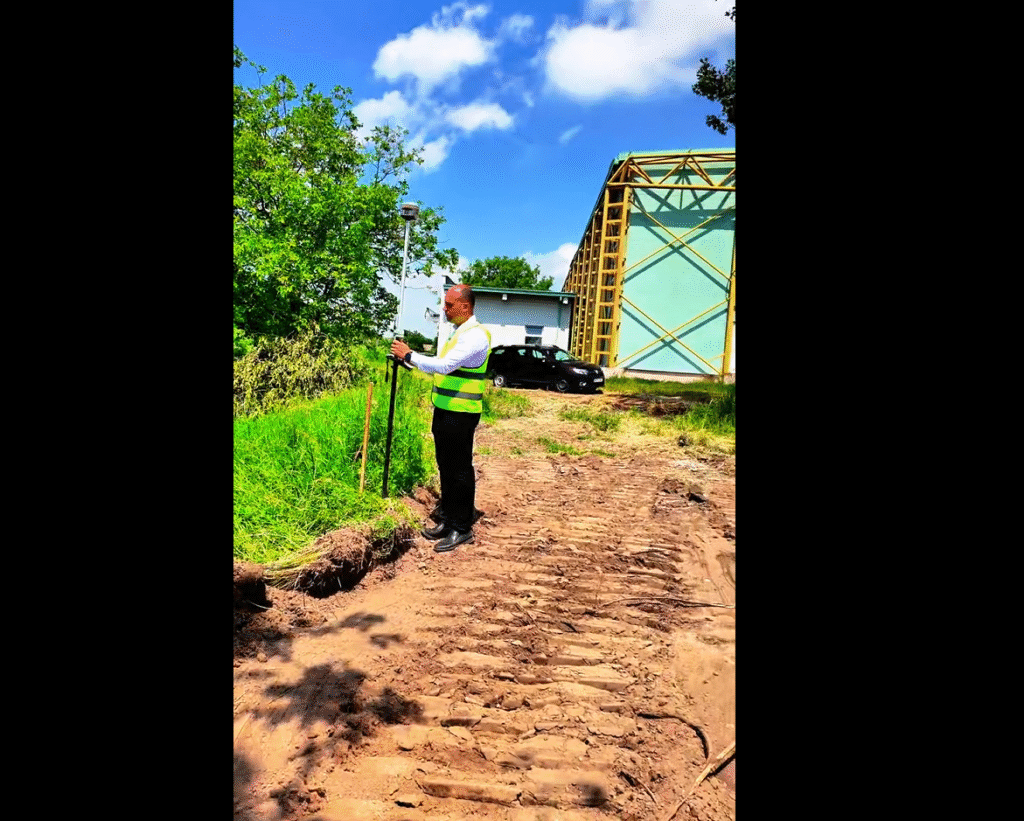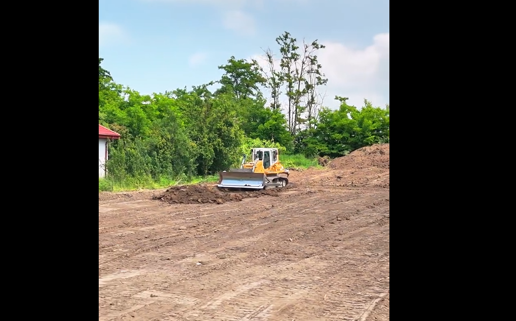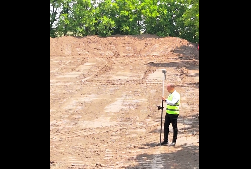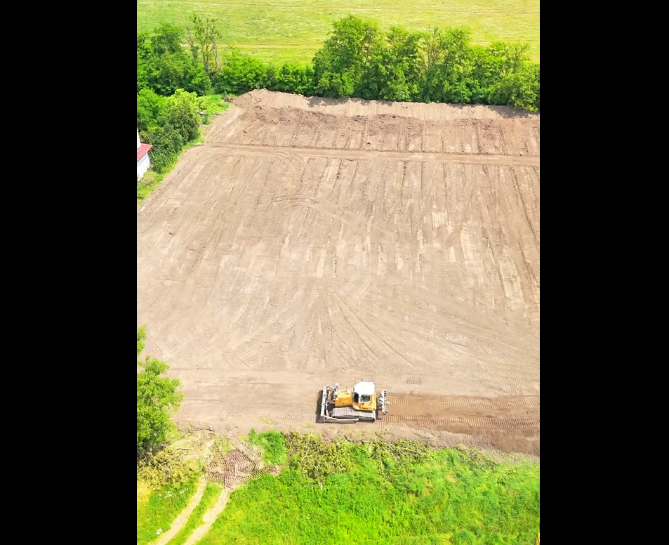 Am venit personal și am trasat terenul, am stabilit și cotele de înclinație. Utilajul din spatele meu lucrează pentru a realiza o suprafață plană și compactă, potrivită pentru un teren de sport.