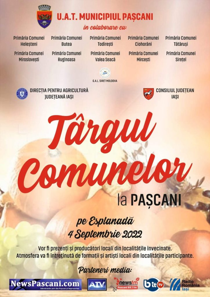 Târgul Comunelor, un eveniment inedit aflat la prima ediție, urmează să aibă loc în acest sfârșit de săptămână pe Esplanada din Pașcani. Primarul municipiului, Marius Pintilie a menționat astăzi în conferința de presă că vor fi prezente persoane importante cum ar fi reprezentanți ai Consulatelor Turciei, Italiei și Republicii Moldova și senatori și deputați ieșeni.