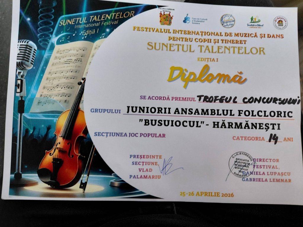 Juniorii Ansamblului Folcloric „Busuiocul” din Hărmănești, coordonați de instructorul Alexandru Jipa, au obținut Trofeul Festivalului „Sunetul Talentelor”, desfășurat la Suceava.