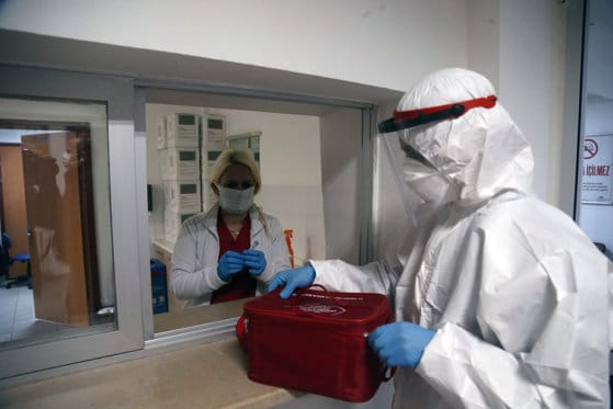 (201231) — ANKARA, Dec. 31, 2020 (Xinhua) — Health workers prepare COVID-19 test in Ankara, Turkey, on Dec. 31, 2020. Turkey reported 14,380 new COVID-19 cases on Thursday, leading its tally to cross 2.2 million amid raging coronavirus pandemic.,Image: 580011572, License: Rights-managed, Restrictions: , Model Release: no