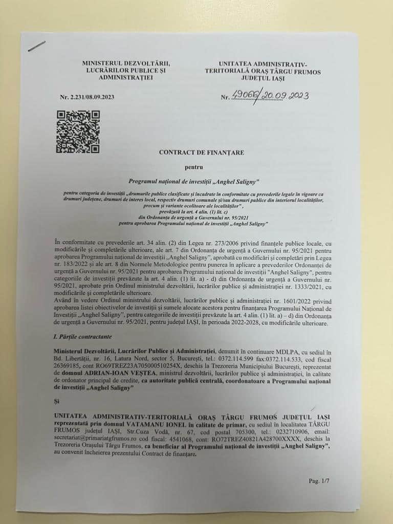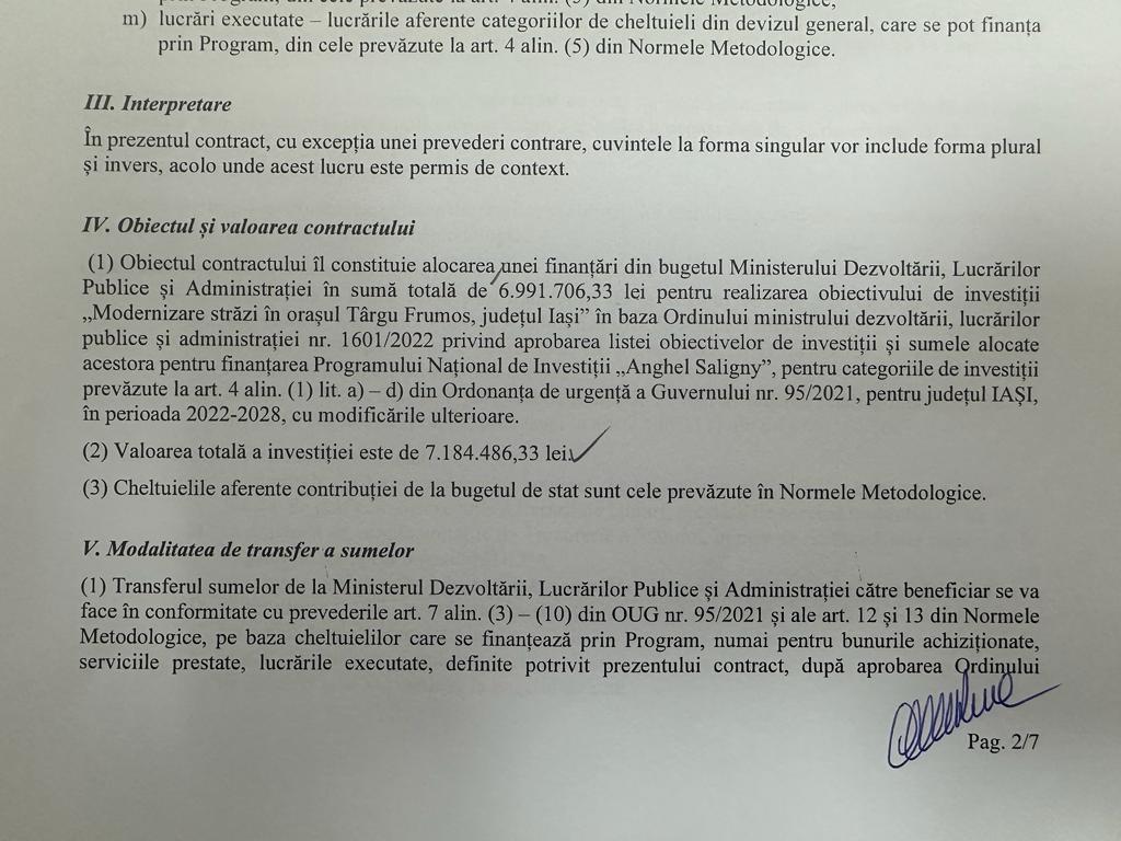 ”Am semnat la Ministerul Dezvoltării, Lucrărilor Publice și Administrației, Contractul de finanțare pentru obiectivul de investiții ,,Modernizare drumuri de interes local pentru: Str. Tineretului 1 şi 2, Str. 22 Decembrie 1989, Str. Fundac Cucuteni, Str. Bogdan Vodă, Str. Buznei, Str. Horia, Str. Cloşca, Str. Vulpii, Str. Casa de Apă, Str. Adâncata și parcarea din incinta blocului 26 în fața Școlii Ion Creangă, valoarea finanțată fiind de aproximativ 7 milioane de lei. Urmează licitația pentru execuția lucrărilor și cu ajutorul lui Dumnezeu din primăvară începem lucrările de asfaltare. În cel mai scurt timp încep lucrările de asfaltare și pentru străzile Pieptănari, Drum lateral Cuza Vodă și Râpei, proiect finanțat de la bugetul local cu o valoare de 1.110.000 lei”, este anunțul făcut de primarul orașului Târgu Frumos, Ionel Vatamanu.