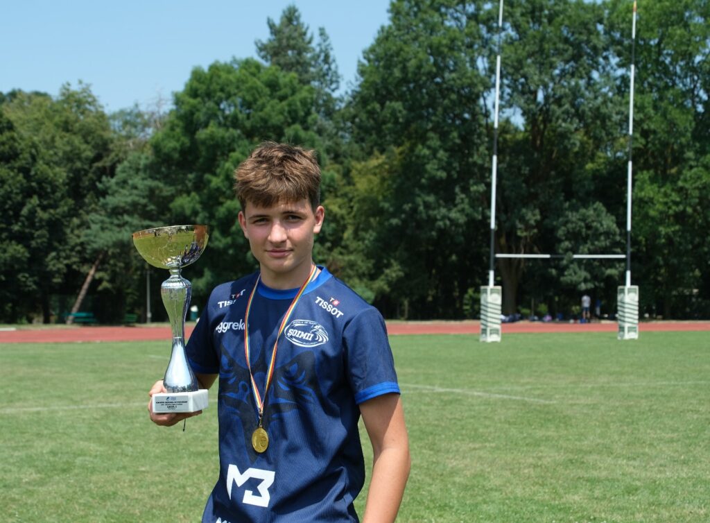 Este vorba despre Matei Borza Pleșcan, în vârstă de 13 ani, care acum activează pentru Șoimii București. Acum două săptămâni de zile, mai exact la mijlocul lunii iulie, a obținut titlul de campion național, la rugby Under 14, cu echipa pentru care activează.