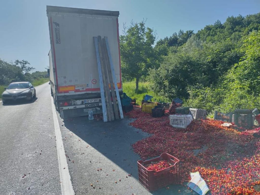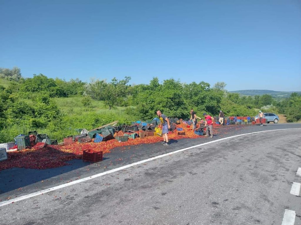 Un accident rutier s-a produs pe DN 28, in zona localitatii Costuleni din județul Iași. Încărcătura unui autotren incarcat cu cirese s-a răsturnat pe partea carosabilă, blocând jumătate din cale.