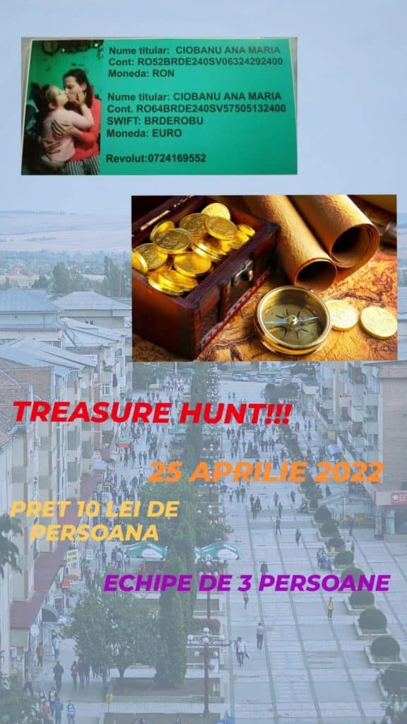 Cine vrea să participe la Vânătoarea de comori, se poate înscrie la următoarele numere de telefon- 0771.068.820-Iuliana și 0738.094.849-Denisa.