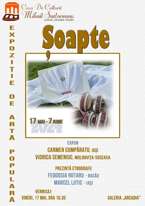 Vineri, 17 mai 2024 începând cu ora 16.30 în sala Arcadia va avea loc vernisajul expoziției de artă populară ,,Șoapte”. Expun Carmen Cumpăratu- Iași și Viorica Semeniuc- Moldovița, Suceava . Prezintă etnografii Feodosia Rotaru-Bacău și Marcel Lutic- Iași. Expoziția poate fi vizitată până pe data de 7 iunie.