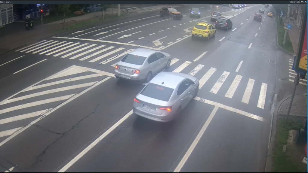 Momentul în care un șofer face stânga pe Str. Independenței din Iași și este lovit de o mașină de pe contrasens a fost surprins de camerele stradale.