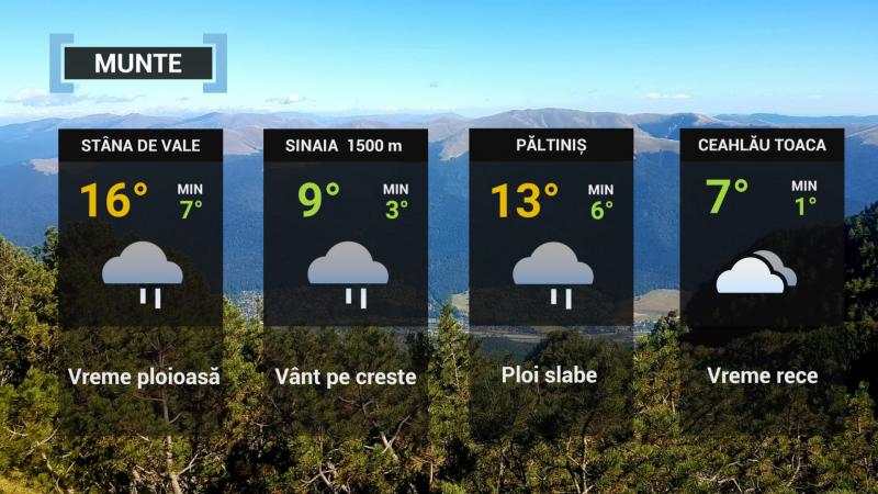 Vremea va fi predominant închisă şi se va răci faţă de intervalul precedent, mai accentuat în masivele sudice şi estice. Va ploua local în Carpaţii Meridionali şi Occidentali şi pe arii restrânse în rest. Ploile vor avea şi caracter de aversă, iar cu totul izolat vor fi posibile descărcări electrice. Cantităţile de apă vor depăşi punctiform 10…15 l/mp. Vântul va avea uşoare intensificări.