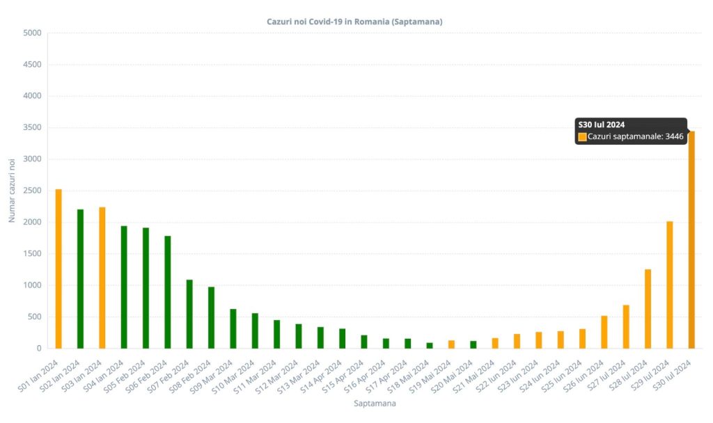 Anunțul de la Iași vine în aceeași zi în care Ministerul Sănătății a pus la dispoziție cifrele cu privire la pandemie pe ultima săptămână. Și aici se înregistrează un record: 3.446 de îmbolnăviri în ultima săptămână, o creștere cu 71% față de săptămâna precedentă și cel mai mare număr de cazuri din 2024.
