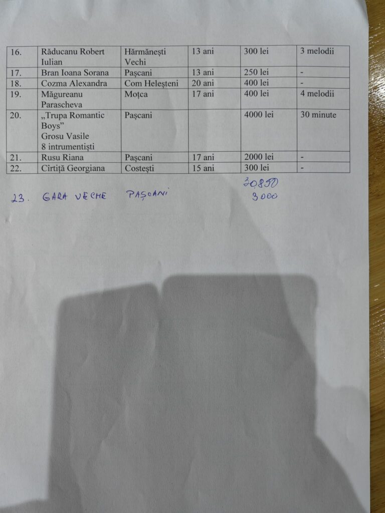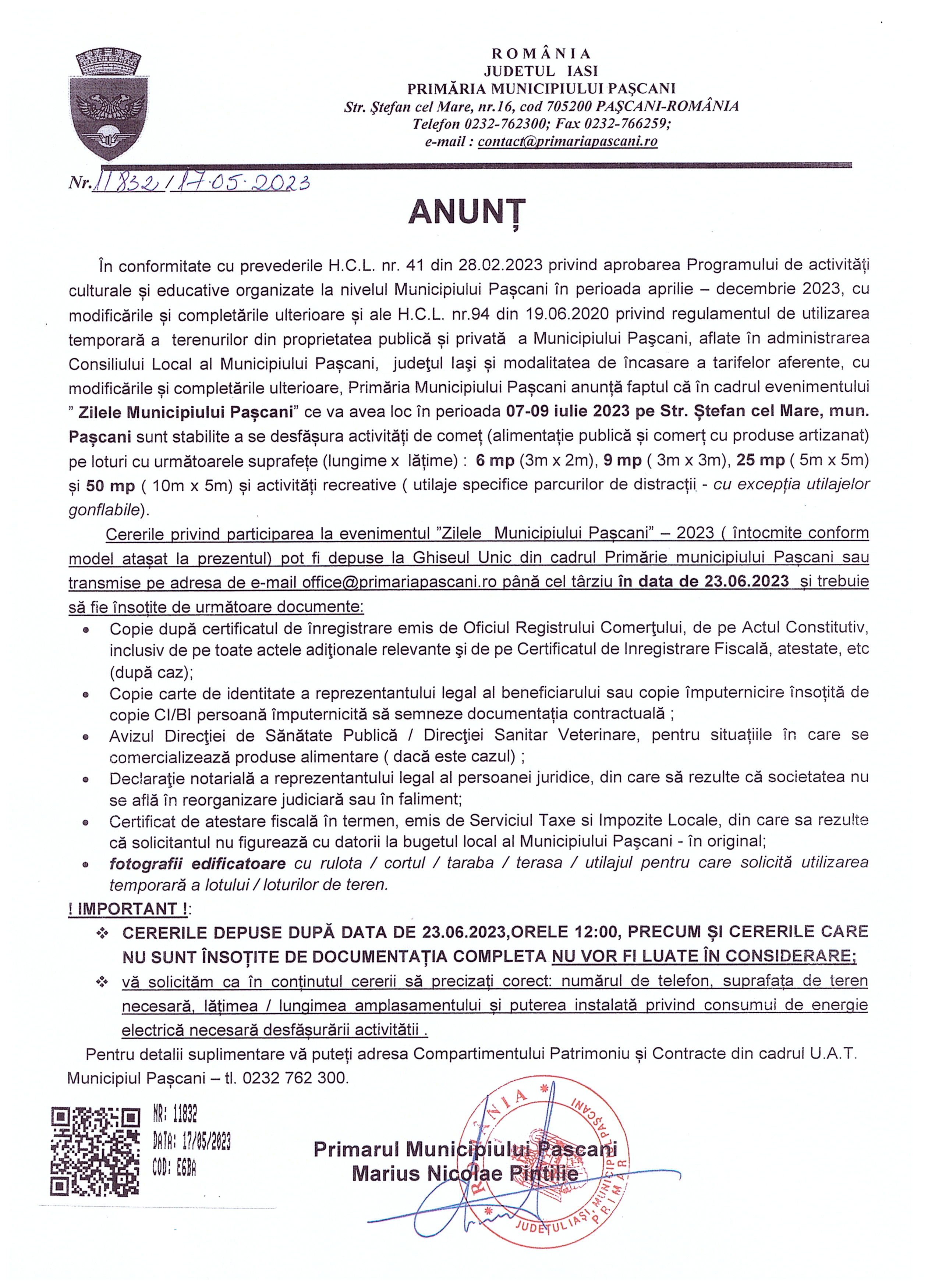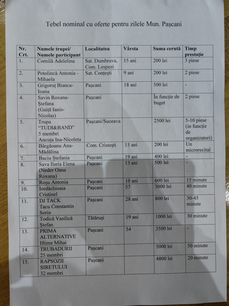“Primăria Municipiului Pașcani anunță faptul că în cadrul evenimentului “Zilele Municipiului Pașcani”, ce va avea loc în perioada 07 – 09 iulie 2023 pe strada Ștefan cel Mare și Sfânt, sunt stabilite a se desfășura activități de comerț (alimentație publică și comert cu produse artizanat) pe loturi cu urmatoarele suprafete (lungime × lätime) : 6 mp (3m x 2m), 9 mp ( 3m x 3m), 25 mp ( 5m × 5m) si 50 mp ( 10m x 5m) si activitati recreative ( utilaje specifice parcurilor de distractii – cu exceptia utilajelor gonflabile). Cererile privind participarea la evenimentul “Zilele Municipiului Pascani” – 2023 ( întocmite conform model atasat la prezentul) pot fi depuse la Ghiseul Unic din cadrul Primárie municipiului Pascani sau transmise pe adresa de e-mail office@primariapascani. ro pânà cel târziu in data de 23.06.2023. CERERILE DEPUSE DUPA DATA DE 23.06.2023, 0RELE 12:00, PRECUM SI CERERILE CARE NU SUNT INSOTITE DE DOCUMENTATIA COMPLETA NU VOR FI LUATE iN CONSIDERARE: va solicităm ca în conținutul cererii sã precizati corect: numárul de telefon, suprafata de teren necesarã, lâtimea / lungimea amplasamentului si puterea instalatà privind consumui de energie electrica necesară desfäsurarii activitâtii. Pentru detalii suplimentare vá putti adresa Compartimentului Patrimoniu si Contracte din cadrul U.A. T. Municipiul Pascani – telefon. 0232 76.23.00″, se arată în anunţul publicat pe site-ul Primăriei Paşcani, după discuţiile din cadrul şedinţei.