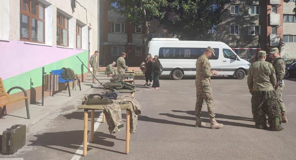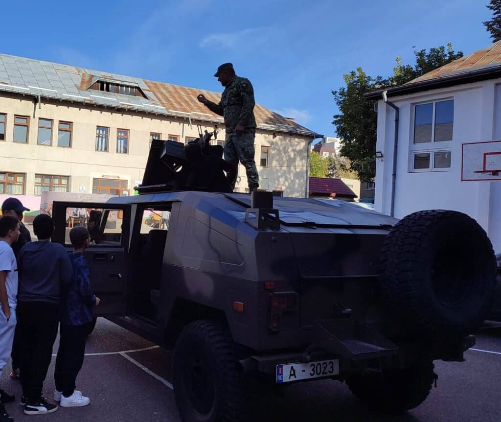 În curtea școlii, tinerii au avut posibilitatea să interacționeze cu militarii la standul amenajat cu tehnică, echipamente militare și materialele de prezentare din dotare.